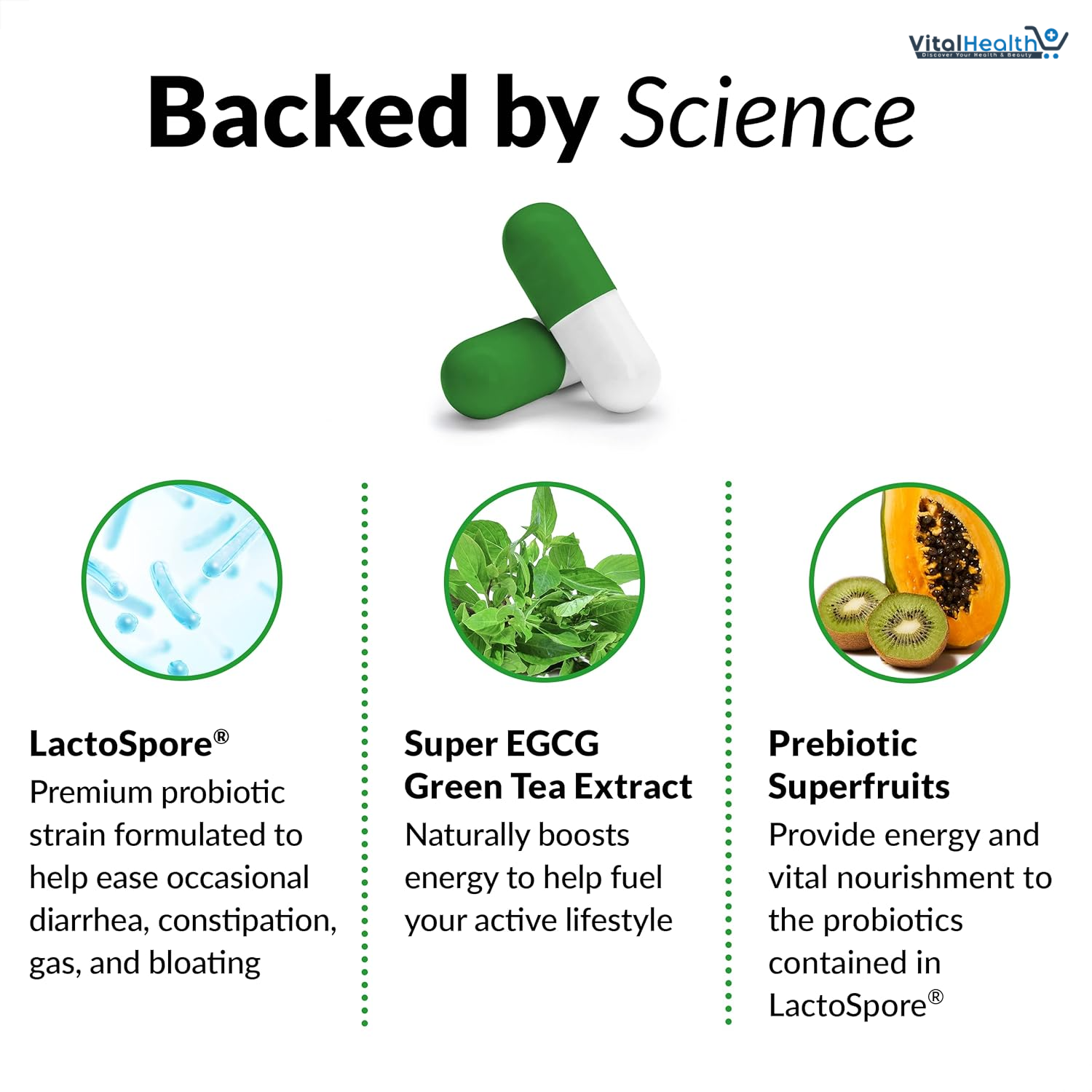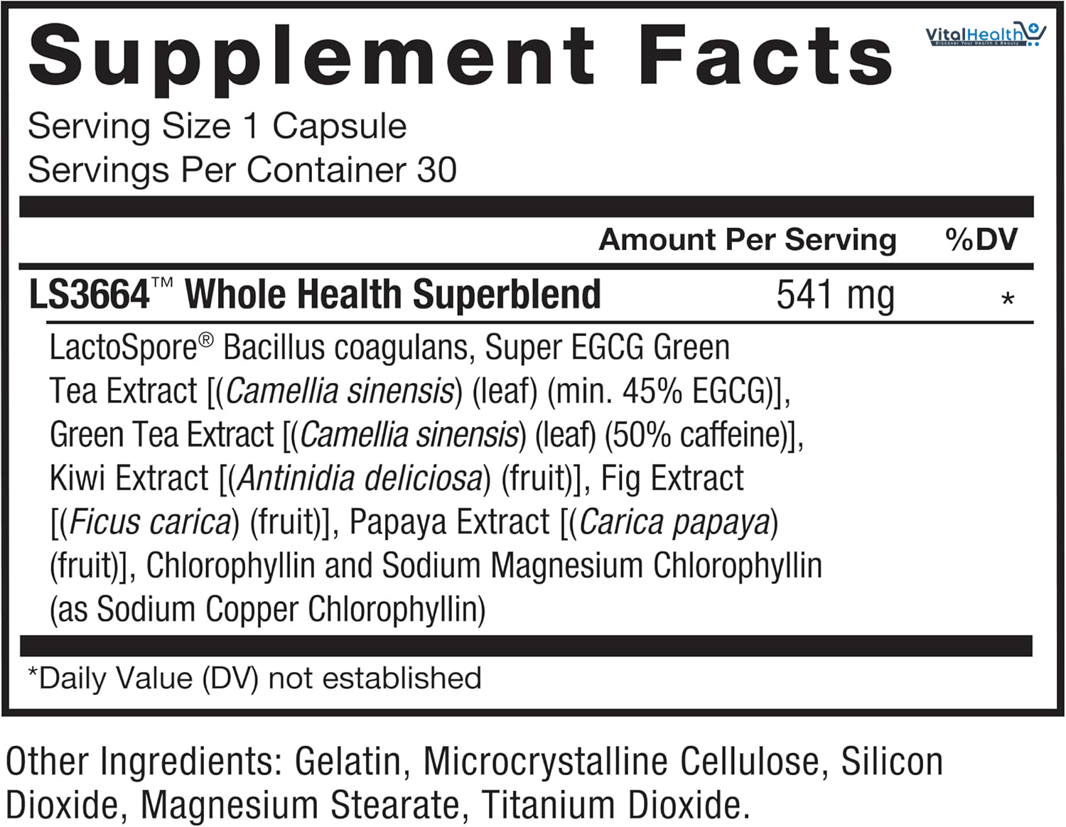 LS3664TM Whole Health Superblend LactoSpore® Bacillus coagulans, Super EGCG Green Tea (Camellia sinensis) Extract (leaf) (min. 45% EGCG), Green Tea (Camellia sinensis) Extract (leaf) (50% caffeine), Kiwi (Actinidia chinensis) Extract (fruit), Fig (Ficus carica) Extract (fruit), Papaya (Carica papaya) Extract (fruit), Chlorophyllin (as Sodium Magnesium Chlorophyllin and Sodium Copper Chlorophyllin), Gelatin, Magnesium Stearate, Microcrystalline Cellulose, Titanium Dioxide, Silicon Dioxide.