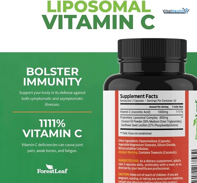 It boost your immunity with ForestLeaf liposomal Vitamin C capsules. Forestleaf vitamin c capsules blend the powerful benefits of MCT oil and sunflower lecithin with dry vitamin c liposomal technology for maximum absorption. Loaded with Vitamin C Support your body year-round with our maximum potency liposomal vitamin c 1000mg. Just two capsules of Forestleaf liposomal vitamin c 1000mg a day help protect your body against harmful symptomatic and asymptomatic illness. ForestLeaf liposomal vitamin c is non-GMO, free of sugar, gluten, dairy and soy, and preservative free. 120 vegan capsules (Allergen Warning: Contains Treenuts, Coconuts).