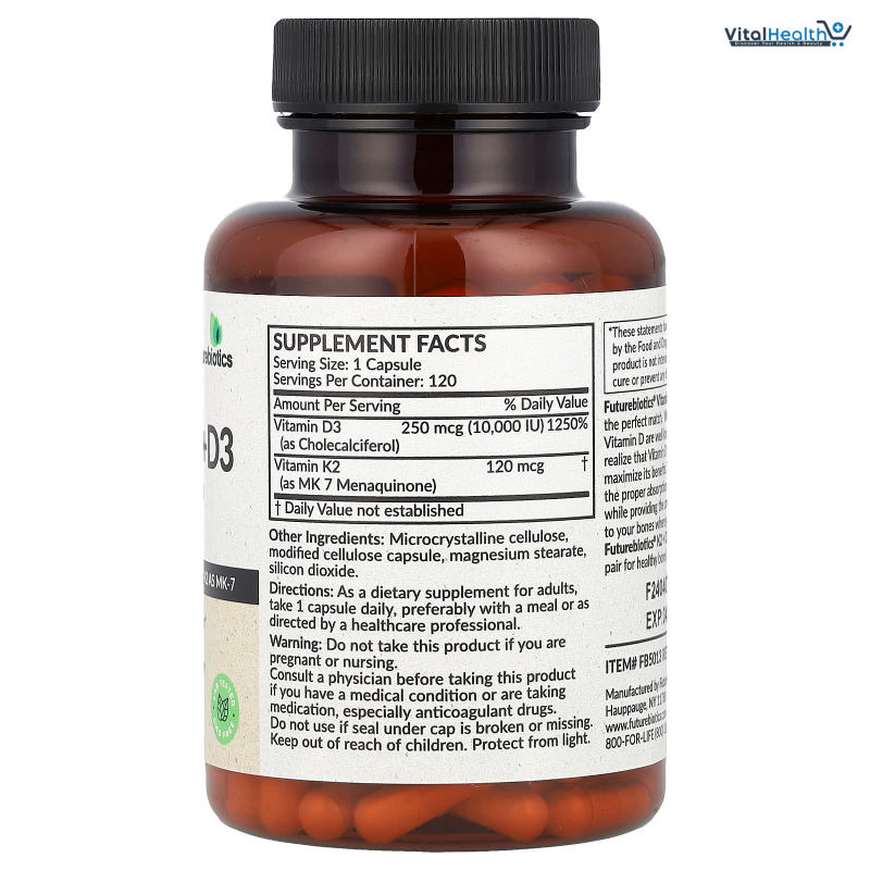 Futurebiotics Vitamins K2+D3 supplies the perfect match. While the benefits of Vitamin D are well known, many don't realize that Vitamin D needs Vitamin K2 to maximize its benefits. This formula helps the proper absorption of calcium with D3, while providing the correct distribution to your bones where you need it most. We only use superior sourced vitamins that are tested and verified for potency, purity and quality. Through our state-of-the-art cGMP Facility, Futurebiotics ensures confidence in the high standards of our products by identifying the quality of every batch provided.