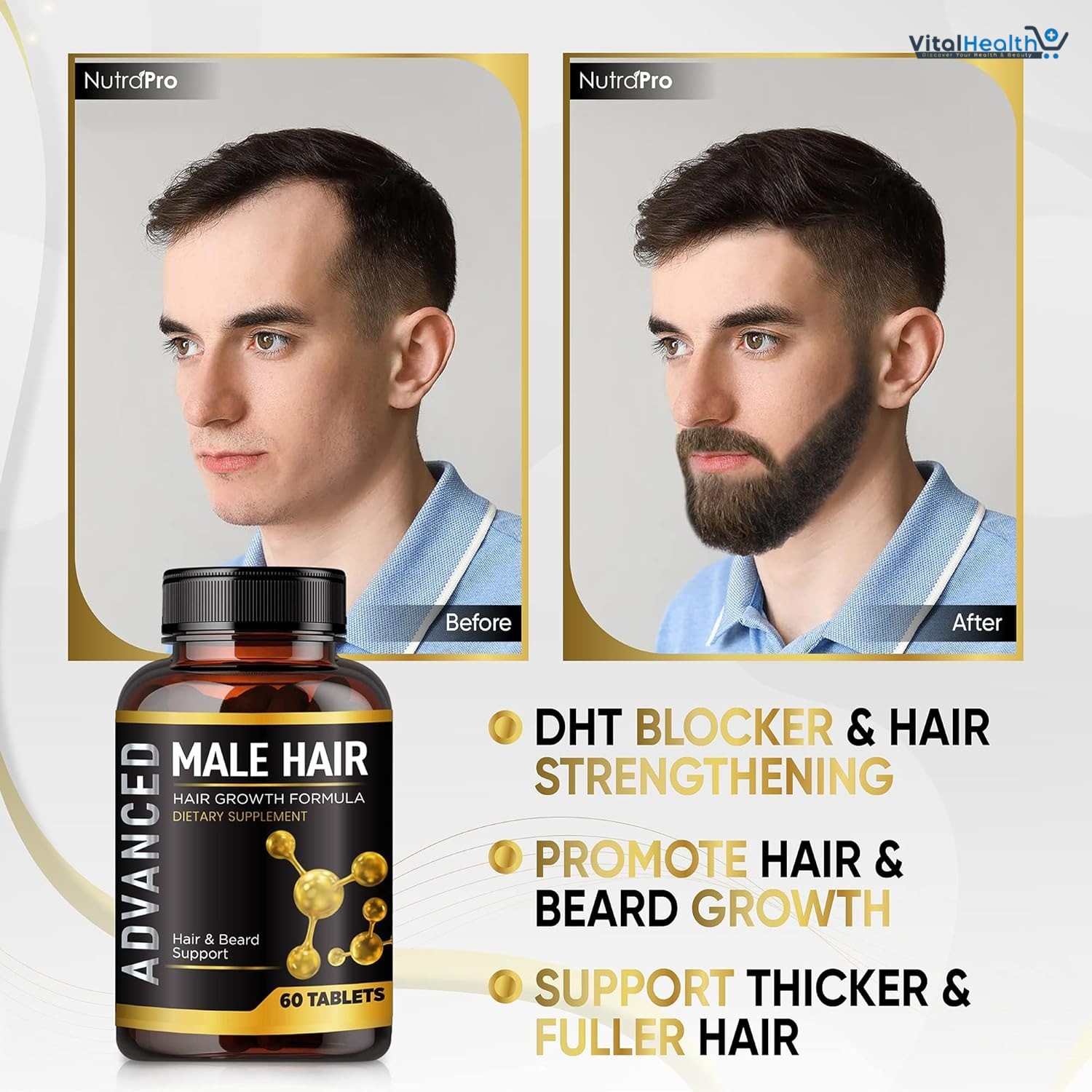 Male Hair supplement formulated especially for male hair. Especially for men experiencing thinning hair due to, stress, bad diet, aging, and unhealthy lifestyle. Get thicker hair in a couple of weeks. Our hair vitamins were formulated especially for men to support the two areas where men are losing hair the most: the hairline and the crown. Nutrapro hair supplement will get your confidence back in a matter of weeks.