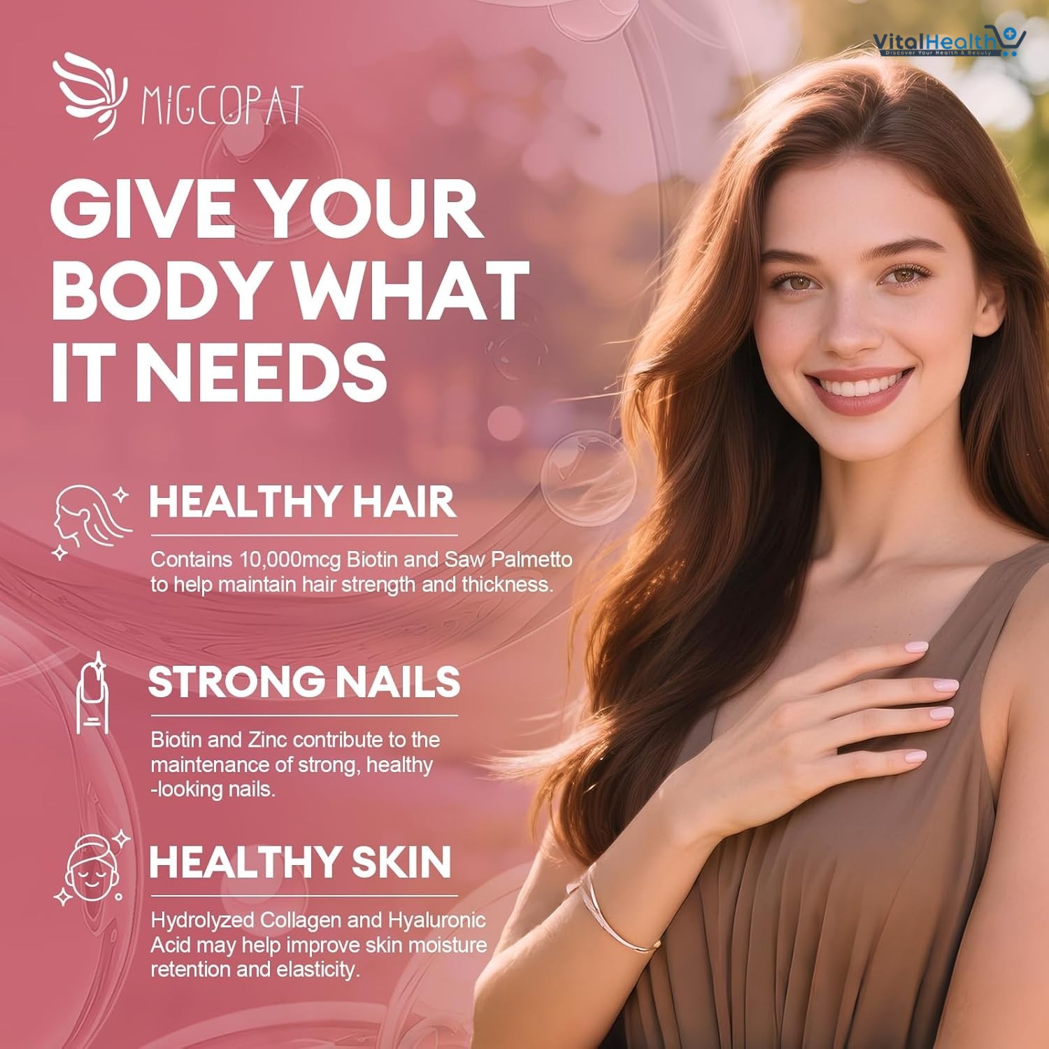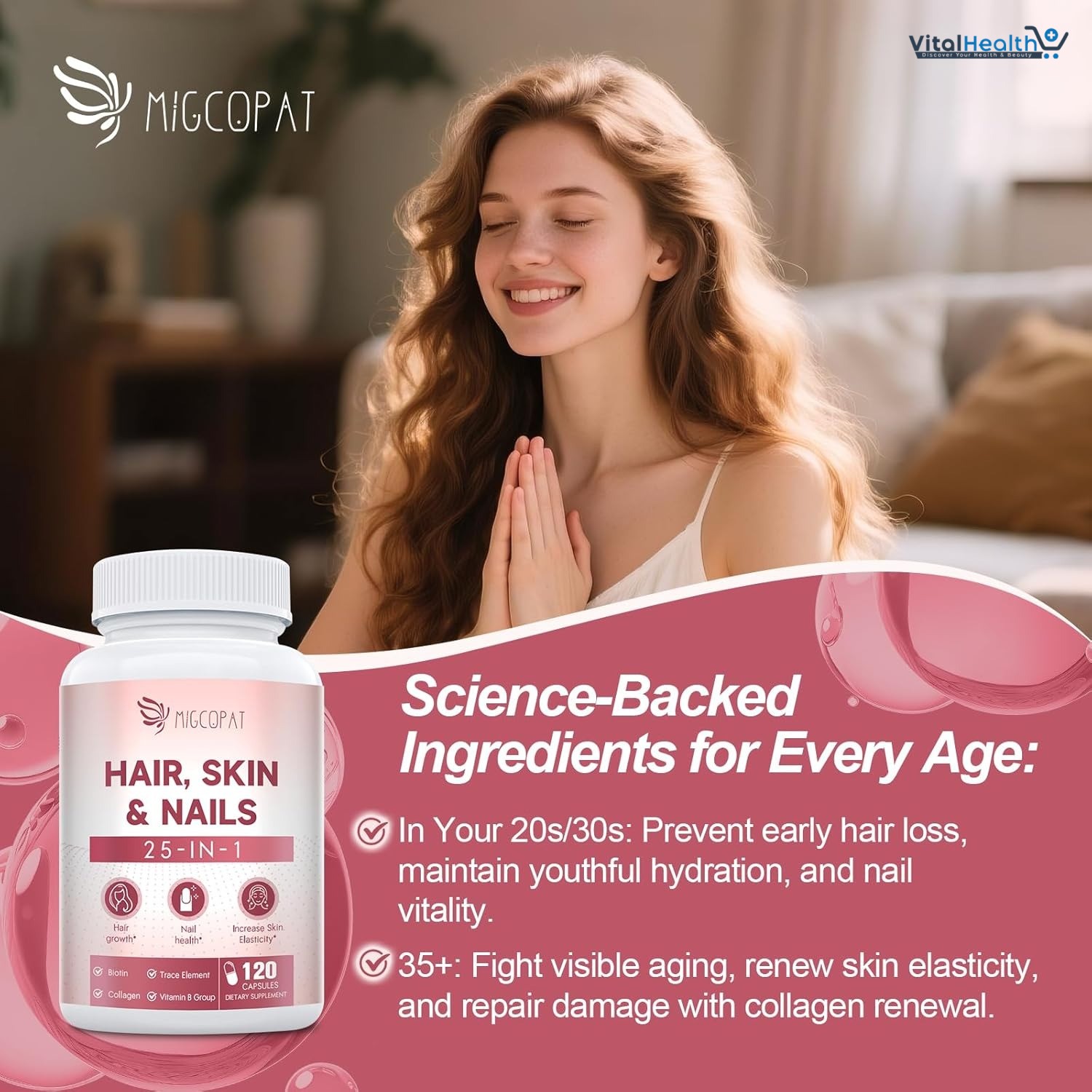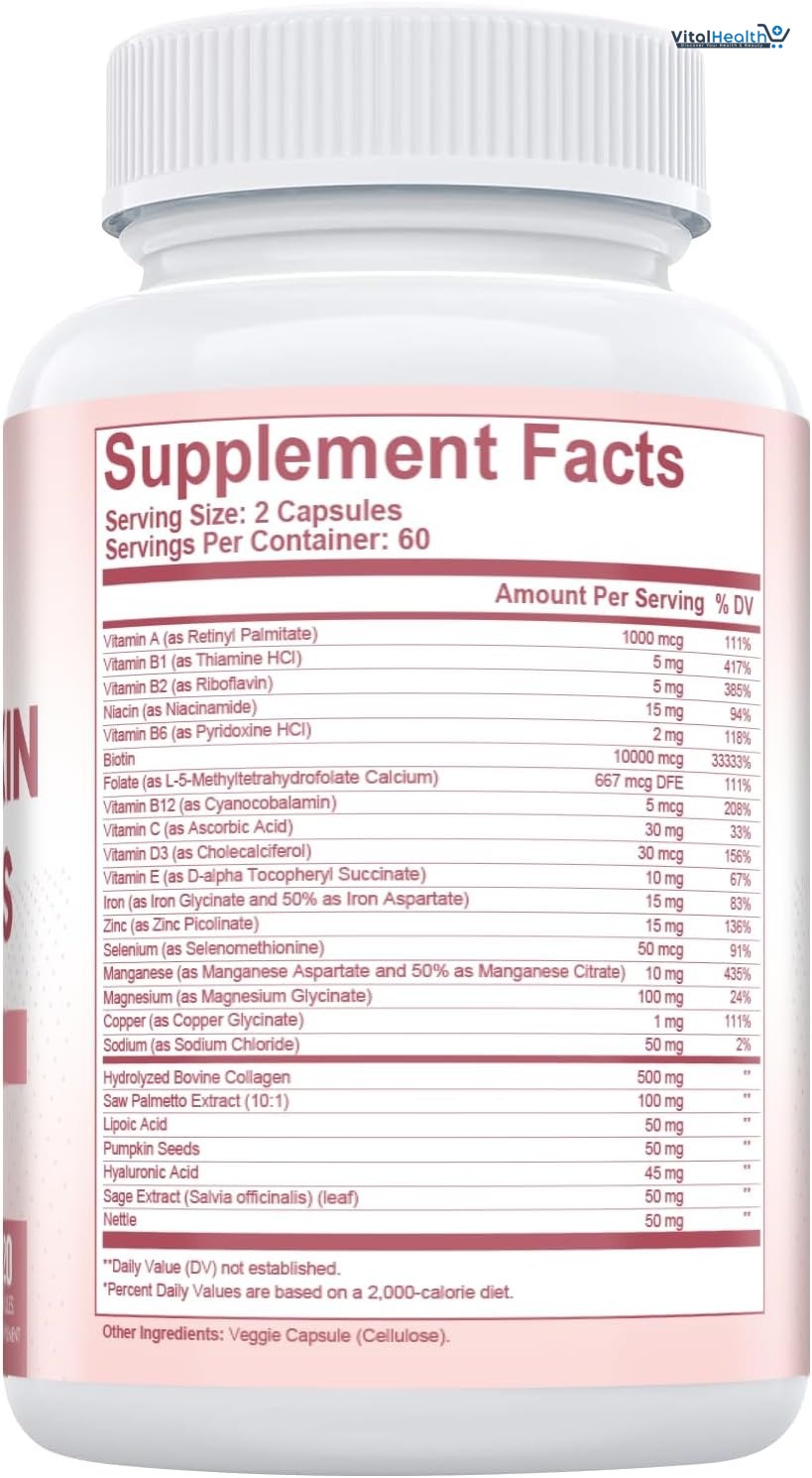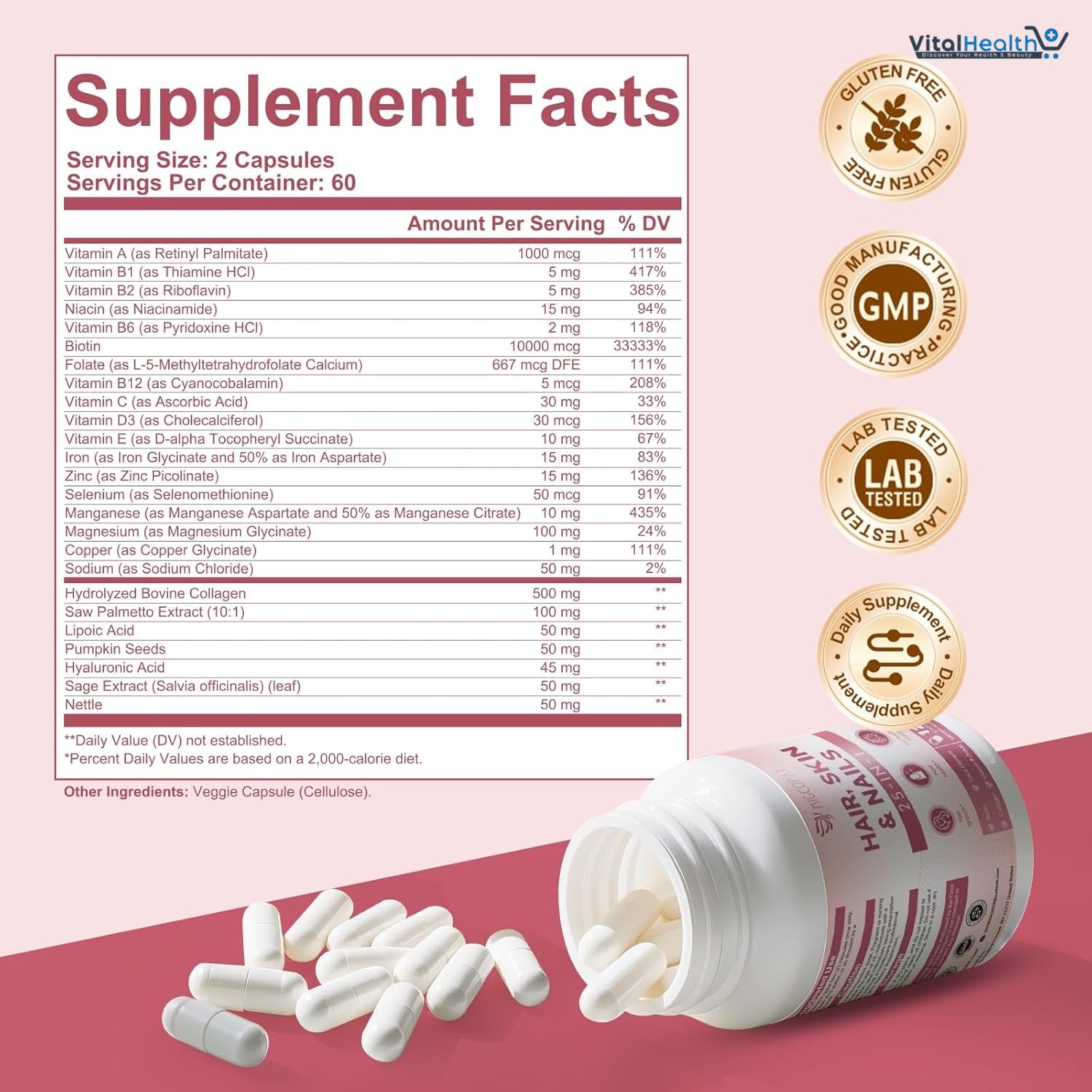 Boost your natural beauty with our advanced 25-in-1 supplement formula. Each capsule contains 500mg Hydrolyzed Bovine Collagen, 100mg Saw Palmetto, 50mg Hyaluronic Acid, and key nutrients to support healthy hair, skin, and nails. This blend of vitamins, minerals, and plant-based botanicals helps fill dietary gaps and promotes overall wellness.