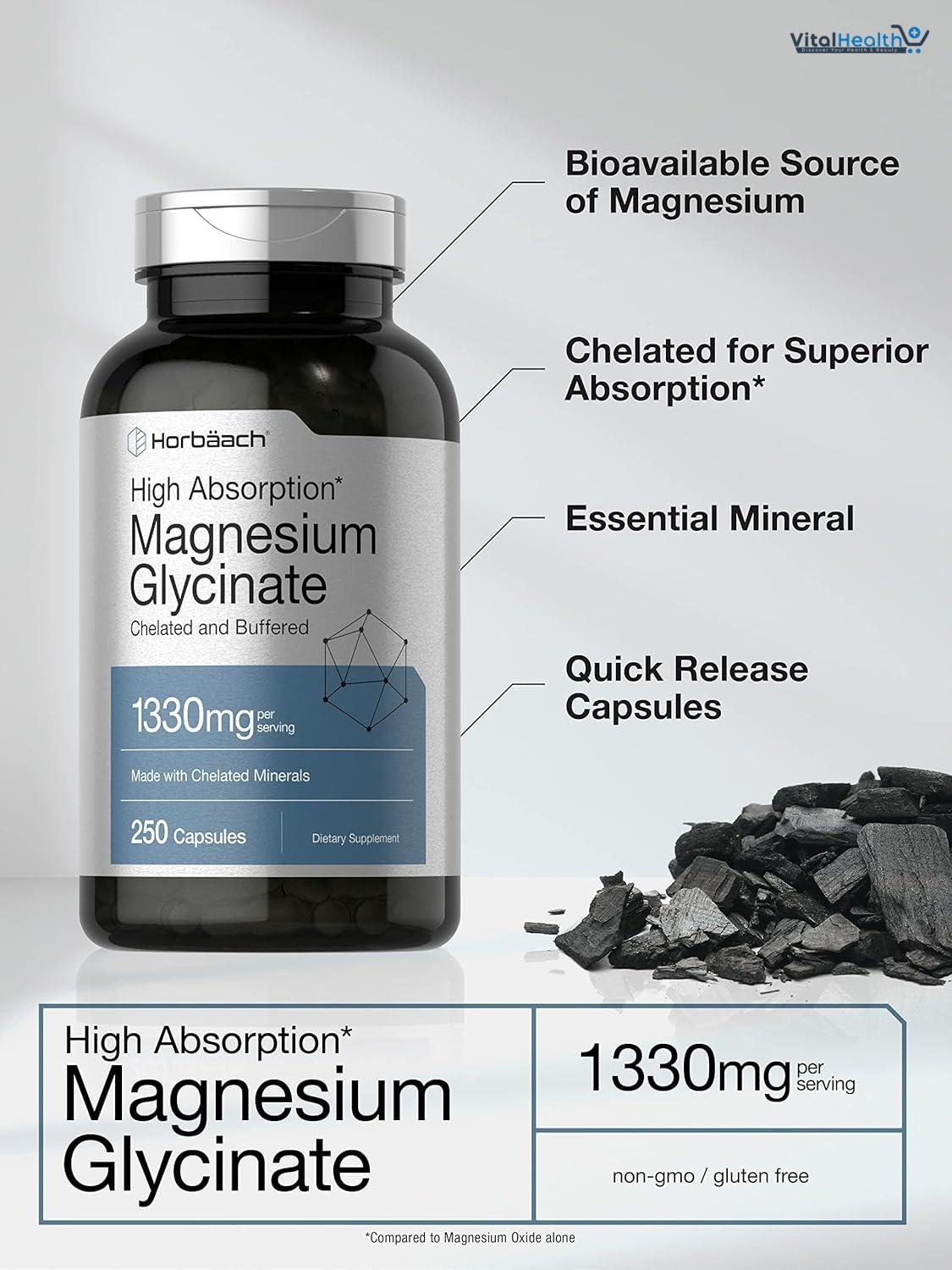 Horbaach's supplement delivers 1330 mg of high absorption, buffered Magnesium Glycinate per serving in Non-GMO and Gluten-Free capsules. It's the best way to obtain a chelated form of this mineral from a trusted source. We laboratory test our formula to ensure the utmost purity and potency making it an excellent addition to any vitamin routine in men and women.