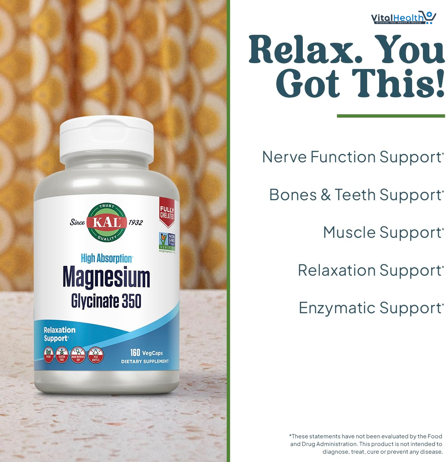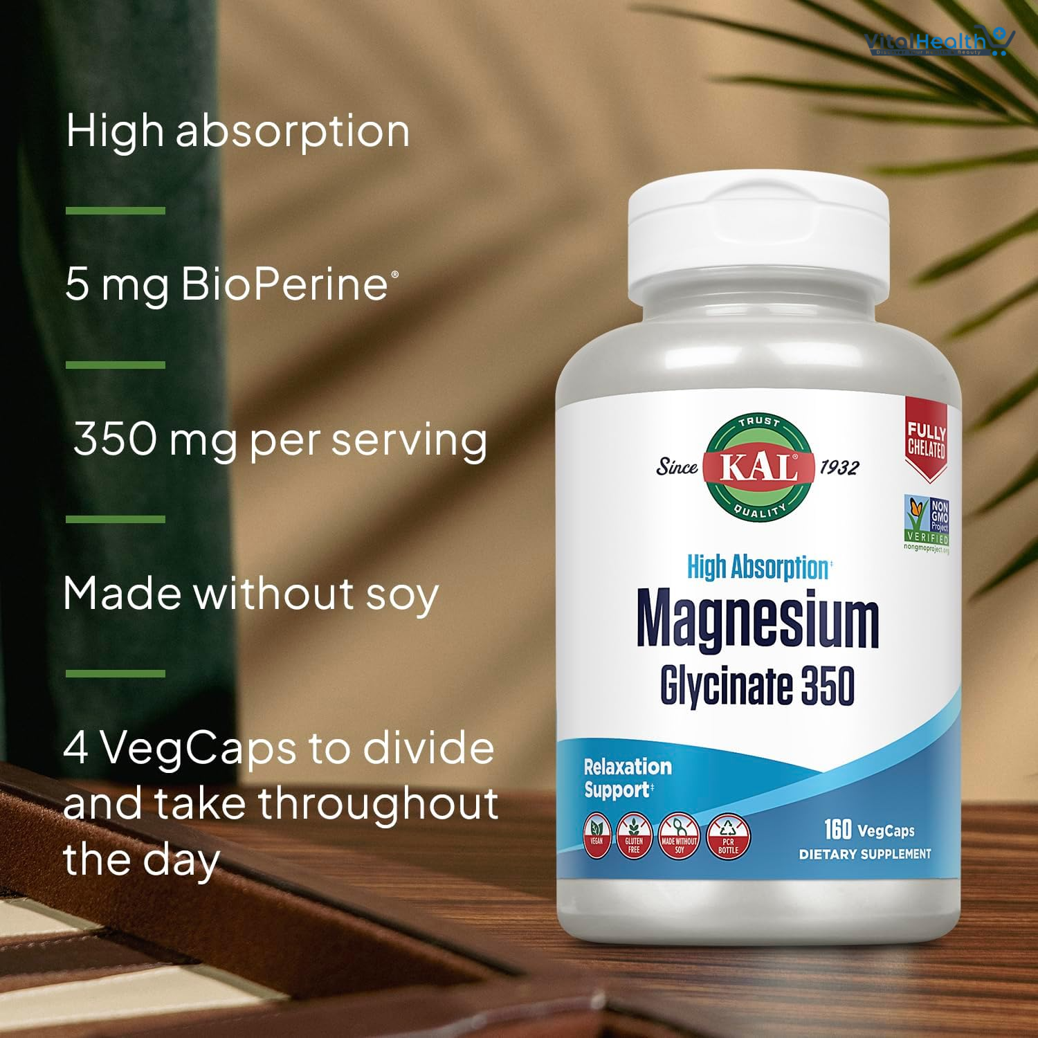 KAL Magnesium Glycinate 350 is a high-absorption magnesium supplement designed to support relaxation, bone health, and muscle function. Sourced from top-quality ingredients, this supplement is gentle on the stomach and suitable for vegan diets. Now available at Nahdi Pharmacies, ensuring quality and reliability.