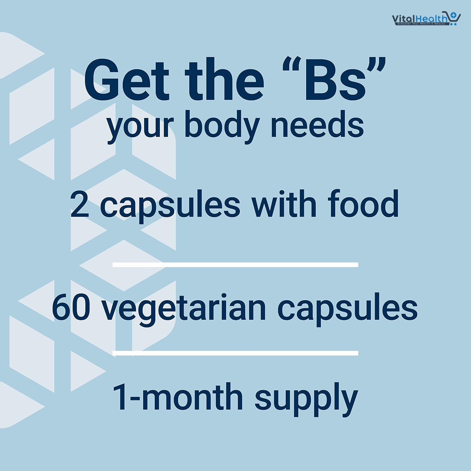 Thiamine (vitamin B1) (as thiamine HCl) 100 mg, Riboflavin (vitamin B2) (as riboflavin and riboflavin 5'-phosphate) 75mg, Niacin (as niacinamide and niacin) 100 mg. Vitamin B6 (as pyridoxine HCl and pyridoxal 5'-phosphate) 100 mg, Folate (as L-5-methyltetrahydrofolate calcium salt) 680 mcg, Vitamin B12 (as methylcobalamin) 300 mcg, Biotin 1000 mcg, Pantothenic acid (as D-calcium pantothenate) 500mg, Calcium (as D-calcium pantothenate, dicalcium phosphate) 50 mg, Inositol 100 mg, PABA (para-aminobenzoic acid) 50 mg