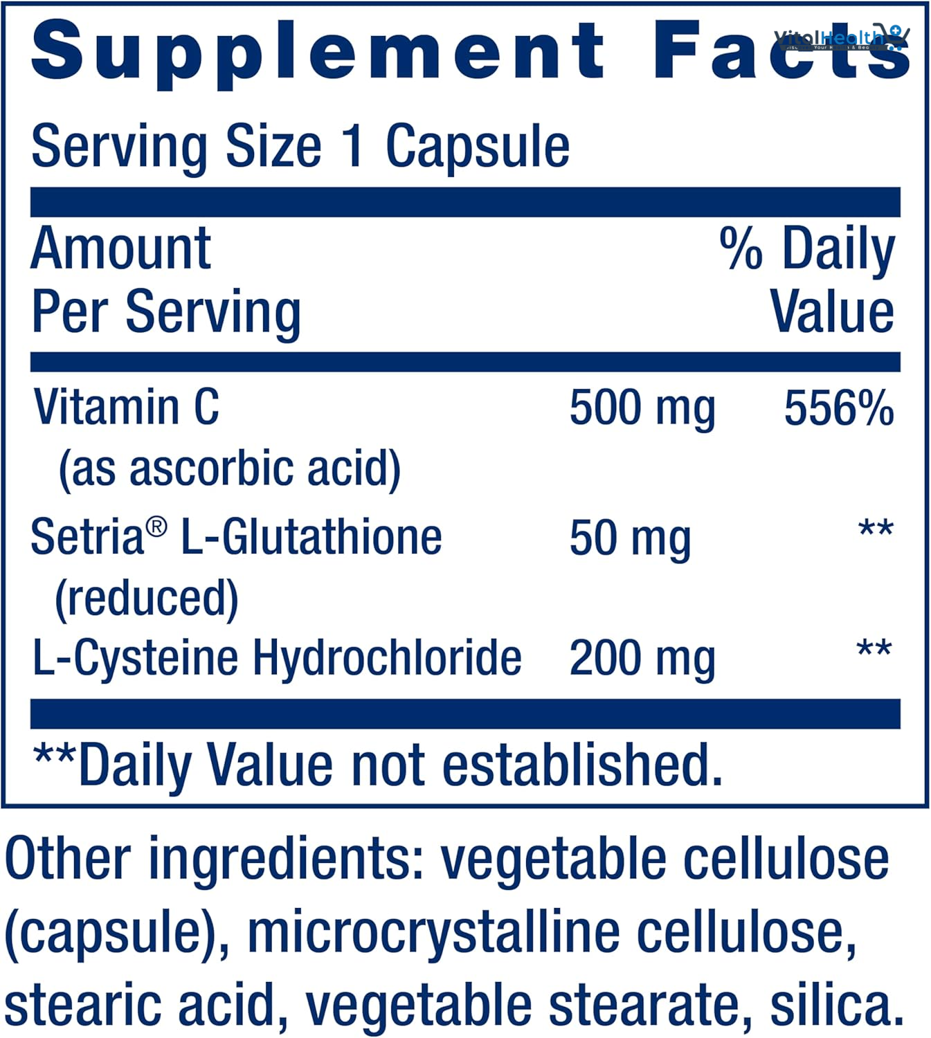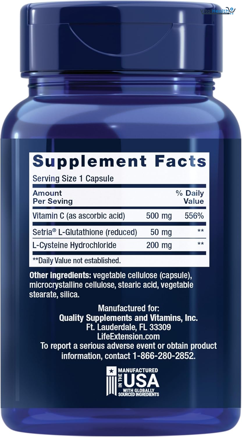 Vitamin C (as ascorbic acid) 500 mg Setria® L-Glutathione (reduced) 50 mg L-Cysteine Hydrochloride 200 mg Other ingredients: vegetable cellulose (capsule), microcrystalline cellulose, stearic acid, vegetable stearate, silica.