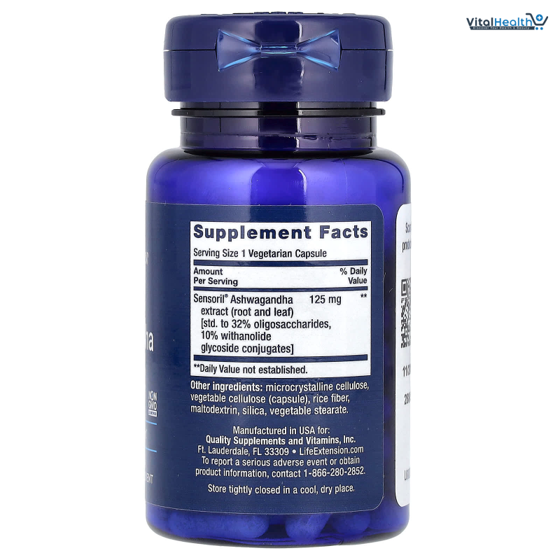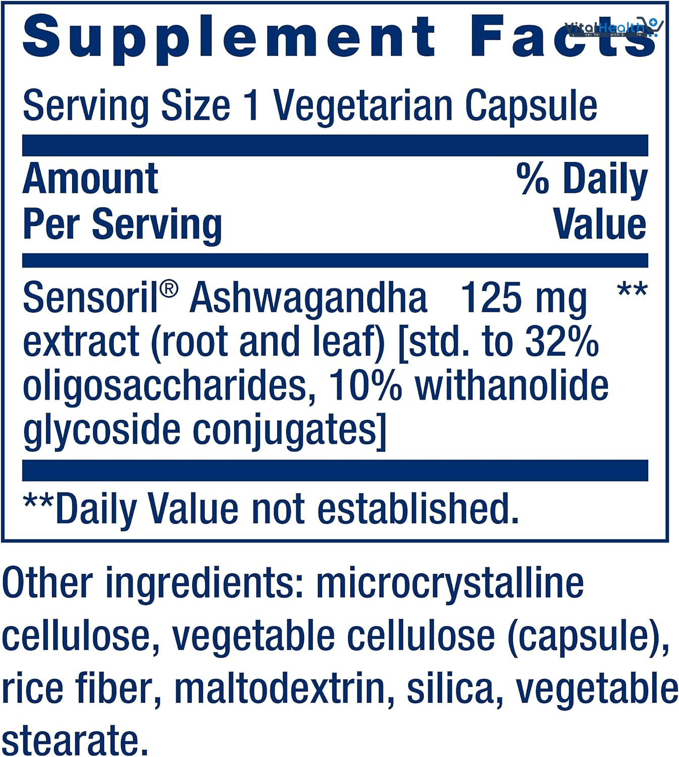 Sensoril Ashwagandha extract (root and leaf) [std. to 32% oligosaccharides, 10% withanolide glycoside conjugates] 125 mg Other ingredients: rice flour, vegetable cellulose (capsule), maltodextrin, vegetable stearate, silica.