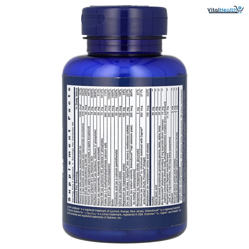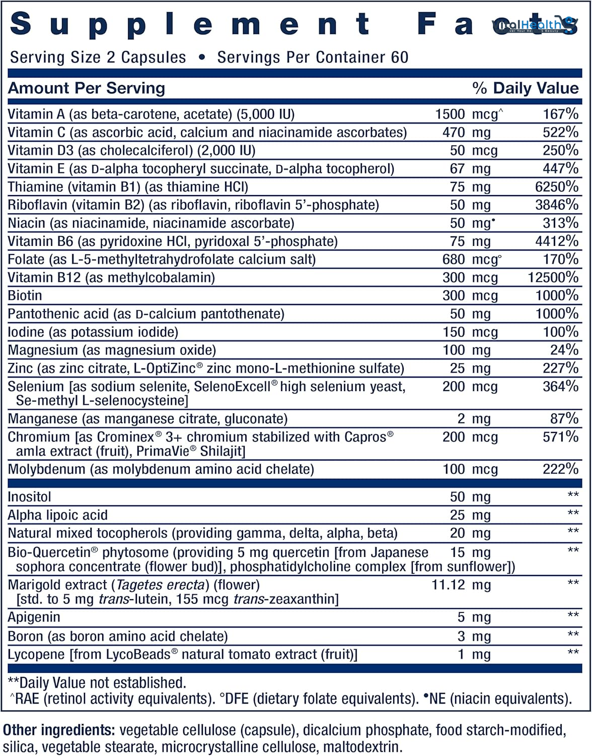 Vitamin A (as beta-carotene, acetate) (5,000 IU) 1500 mcgˆ Vitamin C (as ascorbic acid, calcium and niacinamide ascorbates) 470 mg Vitamin D3 (as cholecalciferol) (2,000 IU) 50 mcg Vitamin E (as D-alpha tocopheryl succinate, D-alpha tocopherol) 67 mg Thiamine (vitamin B1) (as thiamine HCI) 75 mg Riboflavin (vitamin B2) (as riboflavin, riboflavin 5'-phosphate) 50 mg Niacin (as niacinamide, niacinamide ascorbate) 50 mg• Vitamin B6 (as pyridoxine HCI, pyridoxal 5'-phosphate) 75 mg Folate (as L-5-methyltetrahydrofolate calcium salt) 680 mcg° Vitamin B12 (as methylcobalamin) 300 mcg Biotin 300 mcg Pantothenic acid (as D-calcium pantothenate) 50 mg Iodine (as potassium iodide) 150 mcg Magnesium (as magnesium oxide) 100 mg Zinc (as zinc citrate, L-OptiZinc® zinc mono-L-methionine sulfate) 25 mg Selenium [as sodium selenite, SelenoExcell® high selenium yeast, Se-methyl L-selenocysteine] 200 mcg Manganese (as manganese citrate, gluconate) 2 mg Chromium [as Crominex® 3+ chromium stabilized with Capros® amla extract (fruit), PrimaVie® Shilajit] 200 mcg Molybdenum (as molybdenum amino acid chelate) 100 mcg Inositol 50 mg Alpha lipoic acid 25 mg Natural mixed tocopherols (providing gamma, delta, alpha, beta) 20 mg Bio-Quercetin® Proprietary Blend providing 35% quercetin (5 mg) [from Japanese sophora concentrate (flower bud)], 30% galactomannans (4 mg) [from fenugreek (seed)] 14 mg Marigold extract (Tagetes erecta) (flower) [std. to 5 mg trans-lutein, 155 mcg trans-zeaxanthin] 11.12 mg Apigenin 5 mg Boron (as boron amino acid chelate) 3 mg Lycopene [from LycoBeads ® natural tomato extract (fruit)] 1 mg Other ingredients: vegetable cellulose (capsule), dicalcium phosphate, food starch-modified, silica, vegetable stearate, microcrystalline cellulose, maltodextrin, sunflower lecithin, sunflower oil.