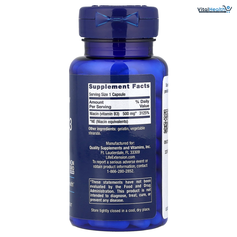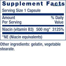 Niacin (vitamin B3) 500 mg, NE (Niacin equivalents), Gelatine, vegetable stearate.