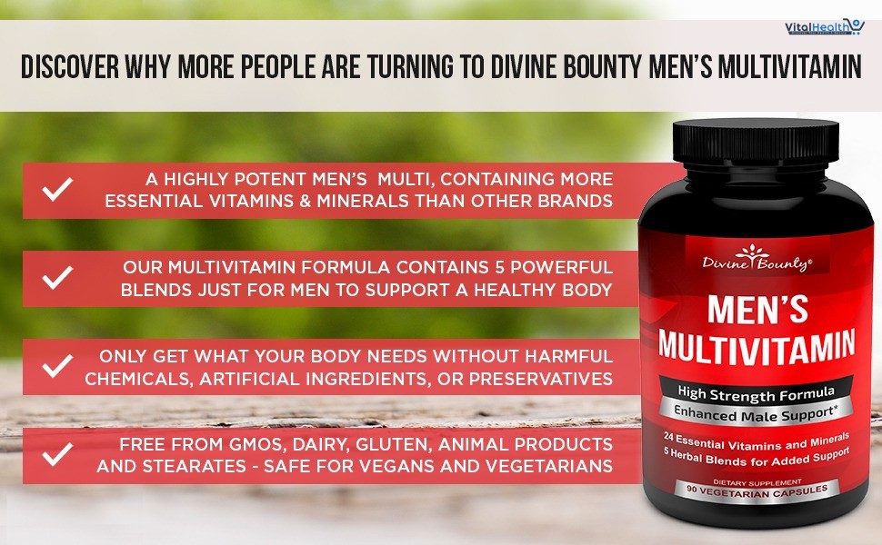 If you are looking for a superior men's multivitamin supplement, look no further! Divine Bounty offers one of the most potent mens multivitamins available. Our extra strength formula not only features all essential vitamins per serving, but it also includes an additional 350mg of enzymes, amino acids, and herbs.