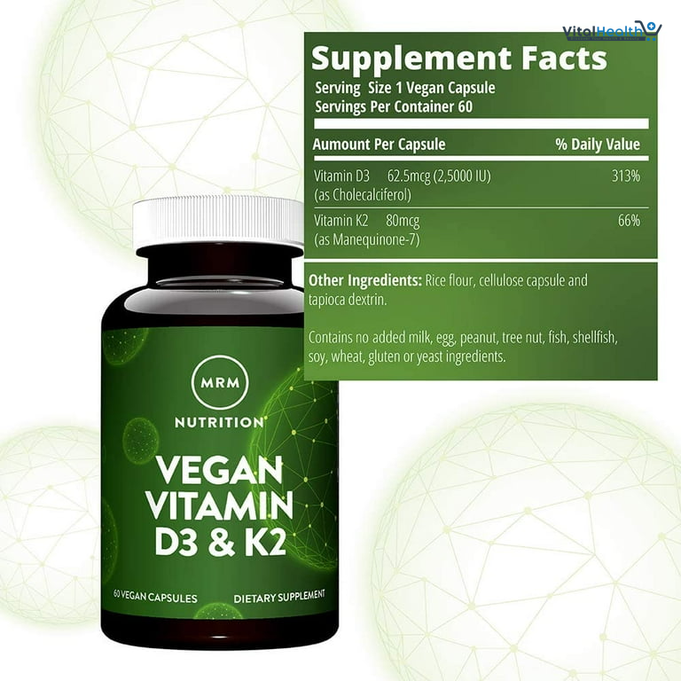 Low levels of vitamin K2 can cause weakened bones and increase calcification of arteries and other soft tissues. Vitamin K2 is the ideal companion nutrient to Vitamin D3 because Vitamin D helps extract calcium from the diet/supplements and K2 helps bind that calcium to the bone matrix to develop strong bones. MRM Vegan Vitamin D3 is a cholecalciferol form of Vitamin D3 that is extracted exclusively from lichens, an algae/fungi commensal organism, to meet calcium and bone health needs of both vegans and vegetarians.