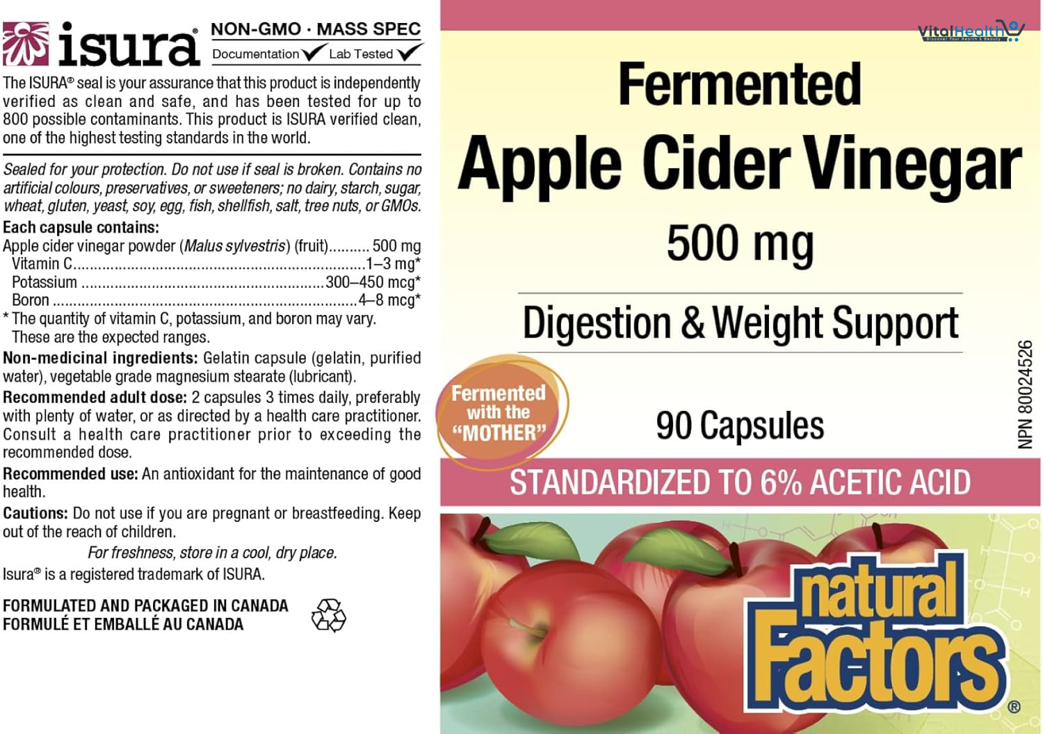Each capsule contains: Apple cider vinegar powder (Malus sylvestris) (fruit) 500 mg, Vitamin C 1–3 mg, Potassium 300–450 mcg, Boron 4–8 mcg, Vegetarian capsule (carbohydrate gum), purified water), magnesium stearate (vegetable grade).