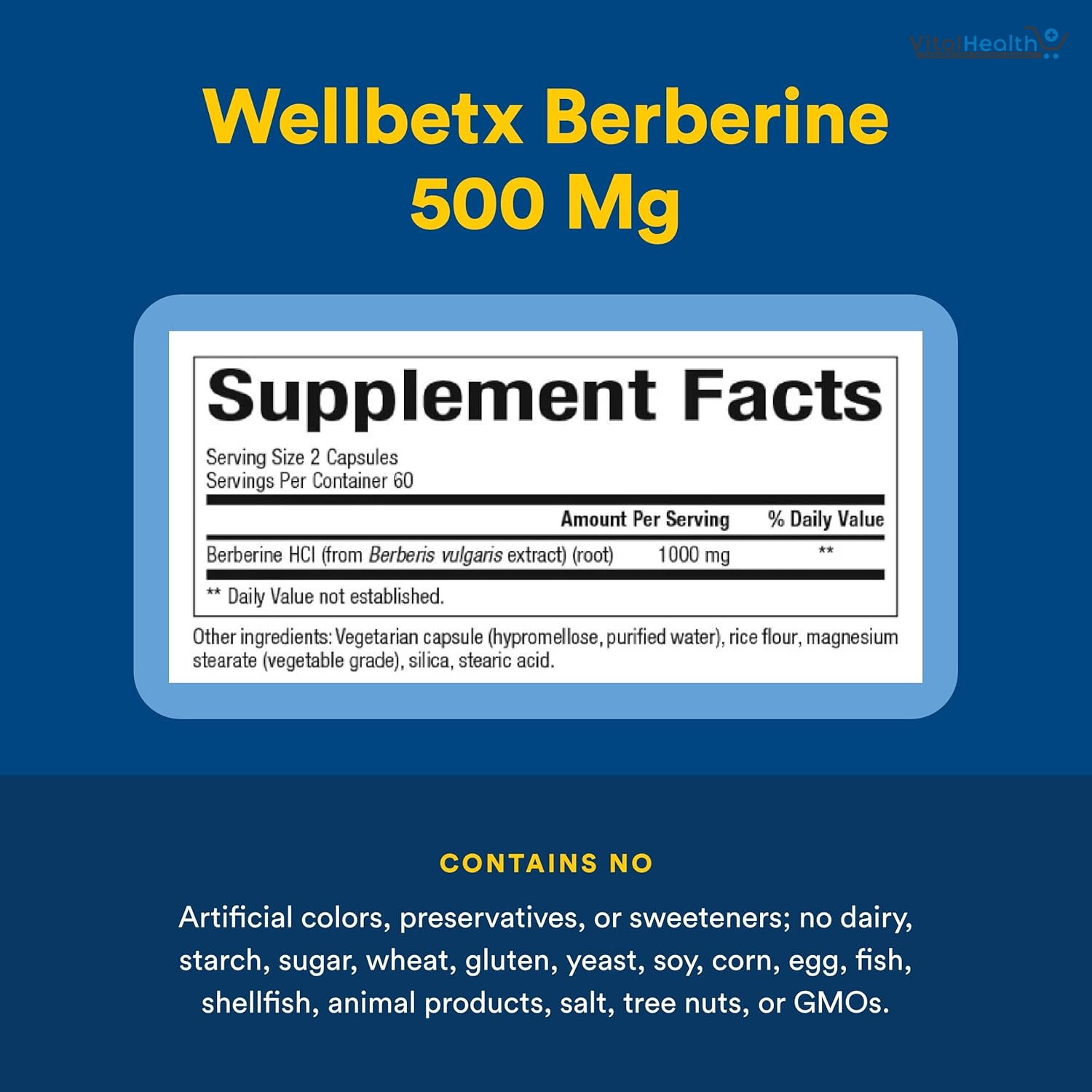 Berberine HCl 1000 mg, Vegetarian Capsule Hypromellose, Purified Water, Rice Flour, Magnesium Stearate, Silica, Stearic Acid