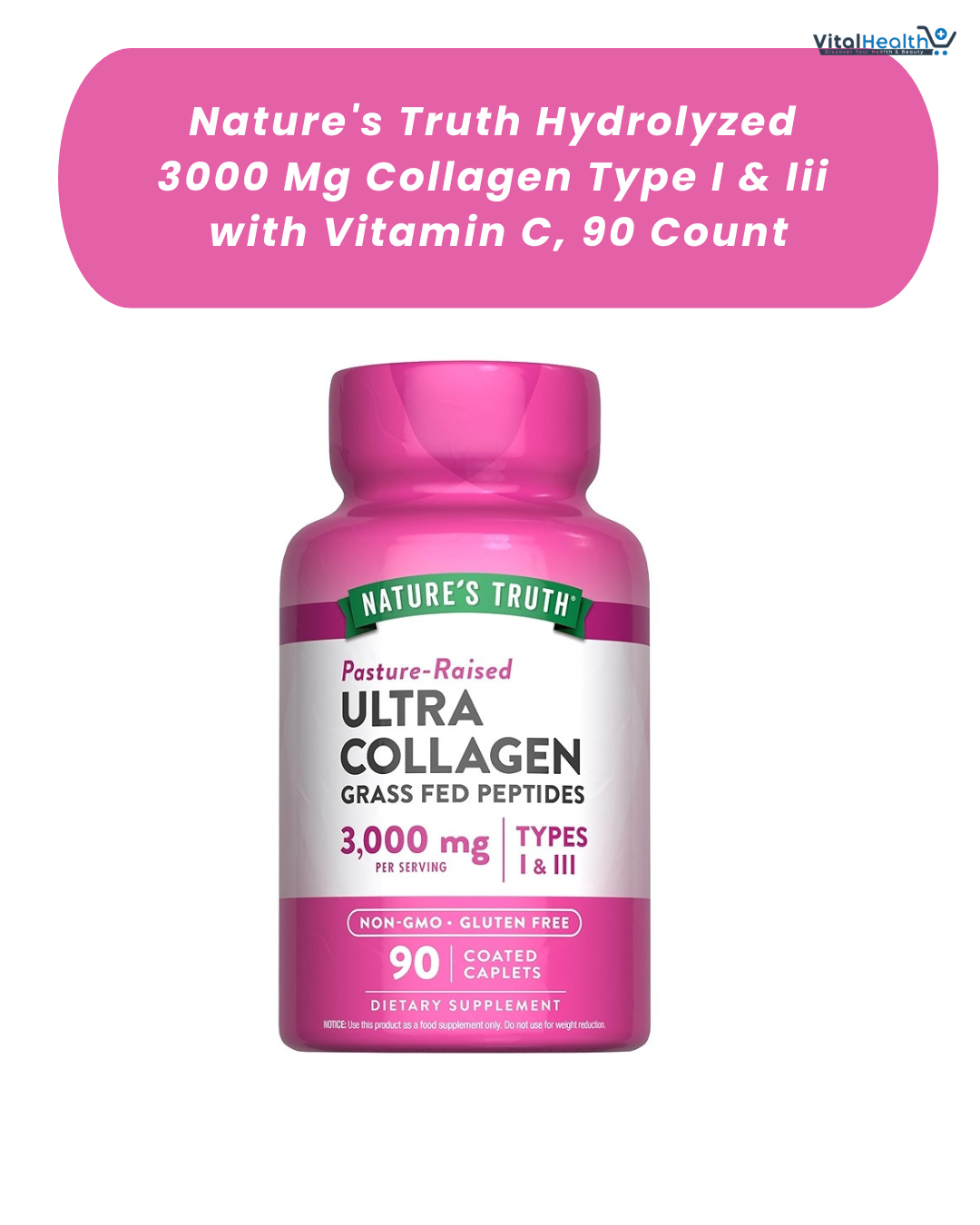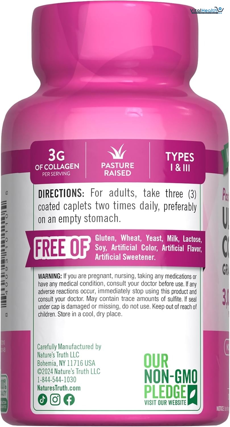 Nature's Truth Ultra Collagen offers 3,000 mg of Type 1 and 3 Collagen Peptides per serving from grass fed bovine. These coated caplets have 30 mg of Vitamin C (as Ascorbic Acid) per serving for added support. Adults can take three coated caplets twice daily to reap the benefits of this supplement.
