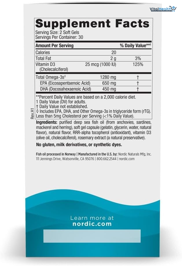 - 1280 mg total omega-3s; 1000 IU Vitamin D3