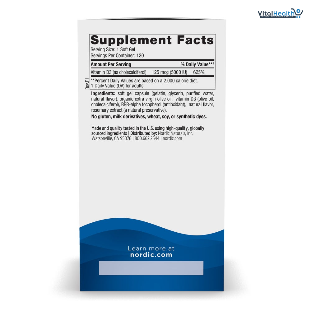 - Each easy-to-swallow, mini Vitamin D3 soft gel provides 5000 IU (125 mcg) of cholecalciferol, the natural, most easily absorbed and utilized form of vitamin D.