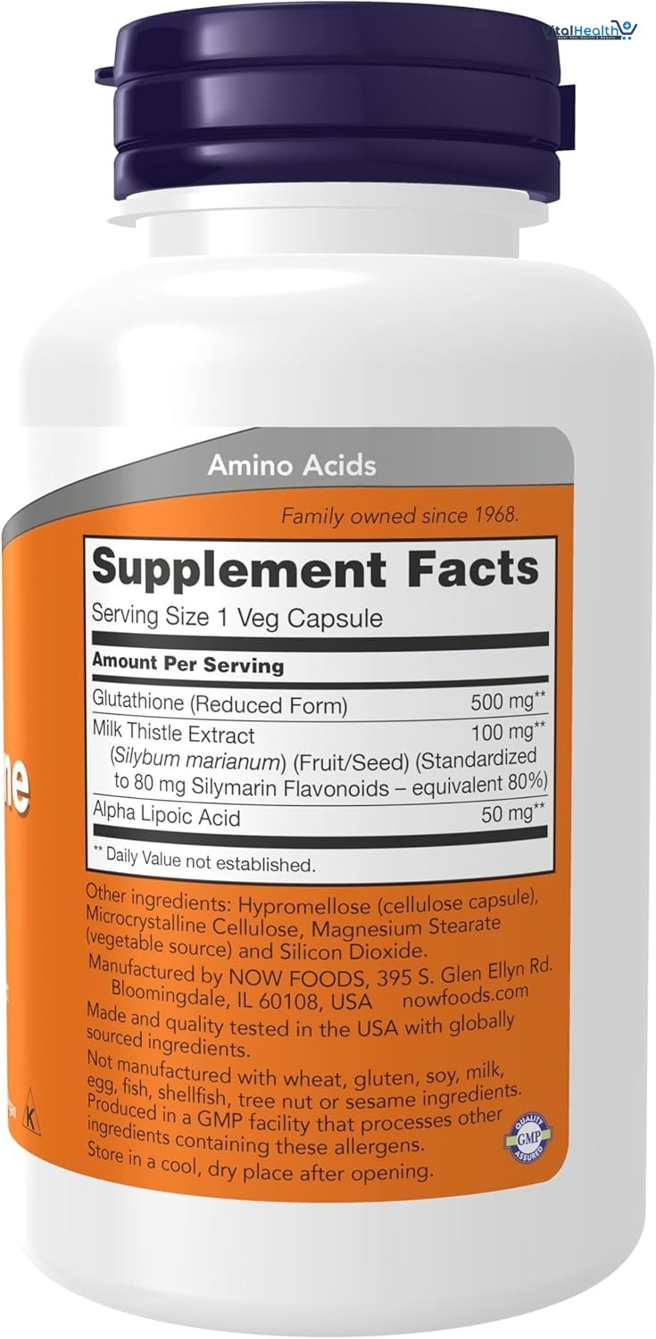 It plays a vital role in maintaining cellular health by directly neutralizing free radicals and by supporting the activity of vitamins C and E. Milk thistle extract and alpha-lipoic acid are included as complementary ingredients.