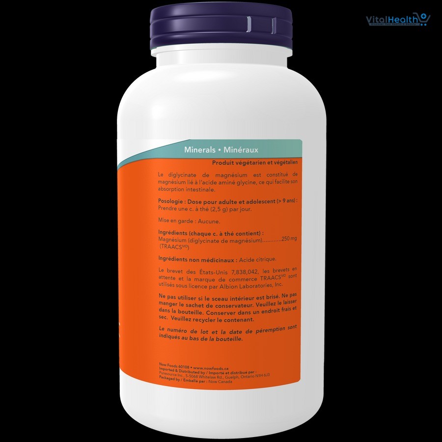 Magnesium bisglycinate uses magnesium bound to the amino acid glycine, which enhances its absorption in the digestive tract. Magnesium is a mineral that activates approximately 300 enzymes, including those that regulate functions essential for energy production and metabolism, muscle contraction, nerve impulse transmission, and bone mineralization.