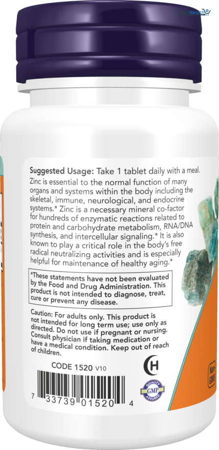 Zinc is essential to the normal function of many organs and systems within the body including the skeletal, immune, neurological, and endocrine systems. Now Foods Zinc is a necessary mineral co-factor for hundreds of enzymatic reactions related to protein and carbohydrate metabolism, RNA/DNA synthesis, and intercellular signaling. It is also known to play a critical role in the body's free radical neutralizing activities and is especially helpful for maintenance of healthy aging.