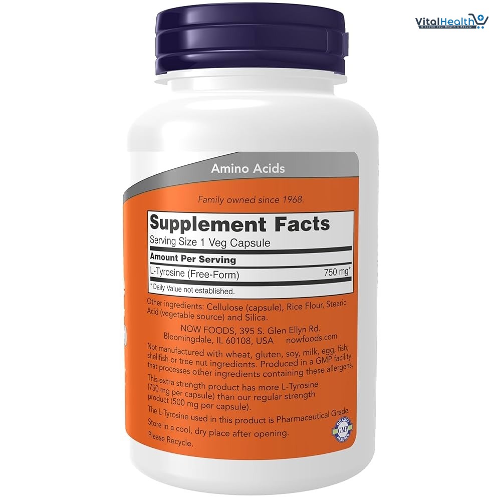Supplement Facts: Serving Size: 1 Veg Capsule; Servings Per Container: 90; Description: Amount per Serving; % Daily Value; L-Tyrosine (Free-Form) 750 mg *Daily Value not established. Other Ingredients: Cellulose (capsule), Rice Flour, Stearic Acid (vegetable source), and Silica. Not manufactured with wheat, gluten, soy, milk, egg, fish, shellfish, or tree nut ingredients.
