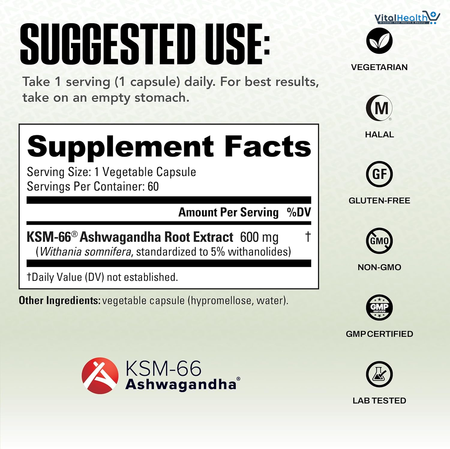 KSM-66 Ashwagandha Root Extract 600mg (Withania Somnifera, Standardized to 5% Withanolides), Vegetable capsule (hypromellose), water).