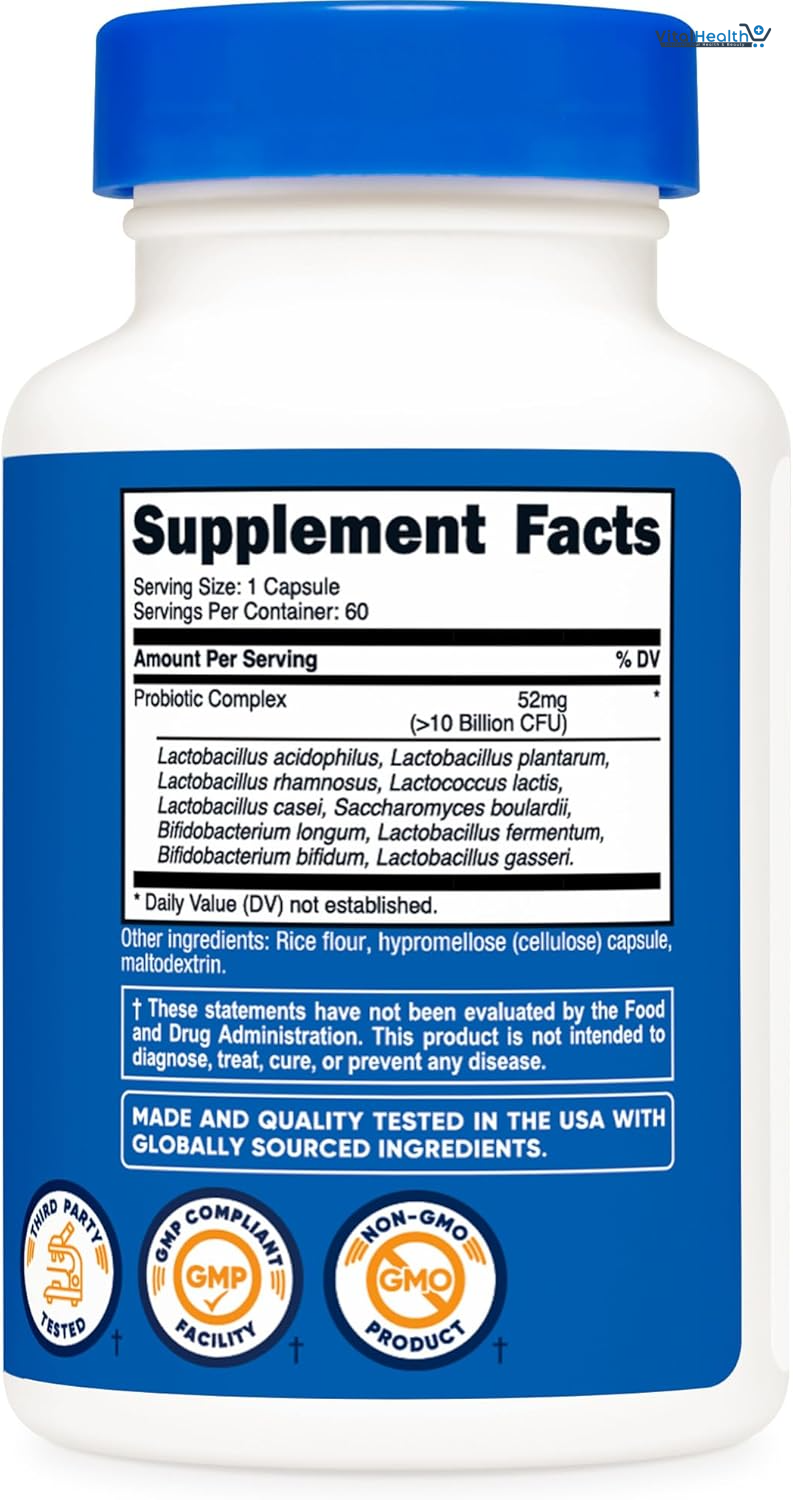 Produced in a GMP-compliant facility and third-party tested, this product meets stringent quality and purity standards. Crafted to be both GMO-free and gluten-free, it reflects a commitment to clean and trusted ingredients. Elevate your daily regimen with Nutricost Probiotic Complex. Probiotics are beneficial live bacteria that support your gut health. Probiotic supplements compete with the healthy bacteria in your gut. Nutricost's Probiotic Complex contains 10 billion CFU made up of 10 different probiotic strains, including lactobacillus acidophilus, lactobacillus plantarum, lactobacillus rhamnosus, lactococcus lactis, lactobacillus casei, saccharomyces boulardii, bifidobacterium longum, lactobacillus fermentum, bifidobacterium bifidum, lactobacillus gasseri.