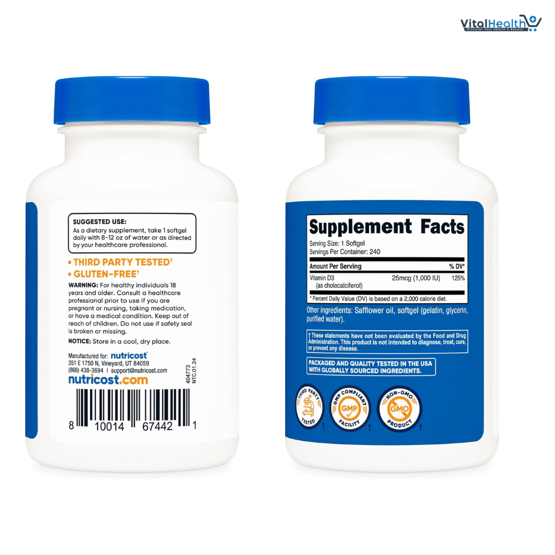 Includes 240 softgels per bottle, offering a long-lasting supply and exceptional value for money, ensuring consistent Vitamin D3 intake for overall wellness. Ideal for individuals needing to increase vitamin D levels due to deficiencies caused by limited sunlight exposure. It is beneficial for those seeking to strengthen bones and prevent osteoporosis through adequate vitamin D intake. It is helpful for users wanting to enhance immune function, especially during cold and flu seasons.