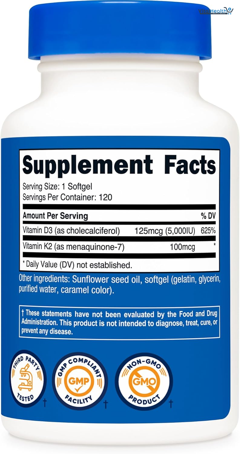 Nutricost 100 mcg Vitamin K2 Per Serving125 mcg Vitamin D3 Per ServingDietary SupplementNutricost® Quality GuaranteedThird Party TestedGMP Compliant FacilityNon-GMO ProductGluten FreeAssists in the activation of the Matrix GLA, a protein that aids in preventing calcium buildup. 100 mcg of Vitamin K2 (mk7) and 5000 IU of Vitamin D3 in every serving.