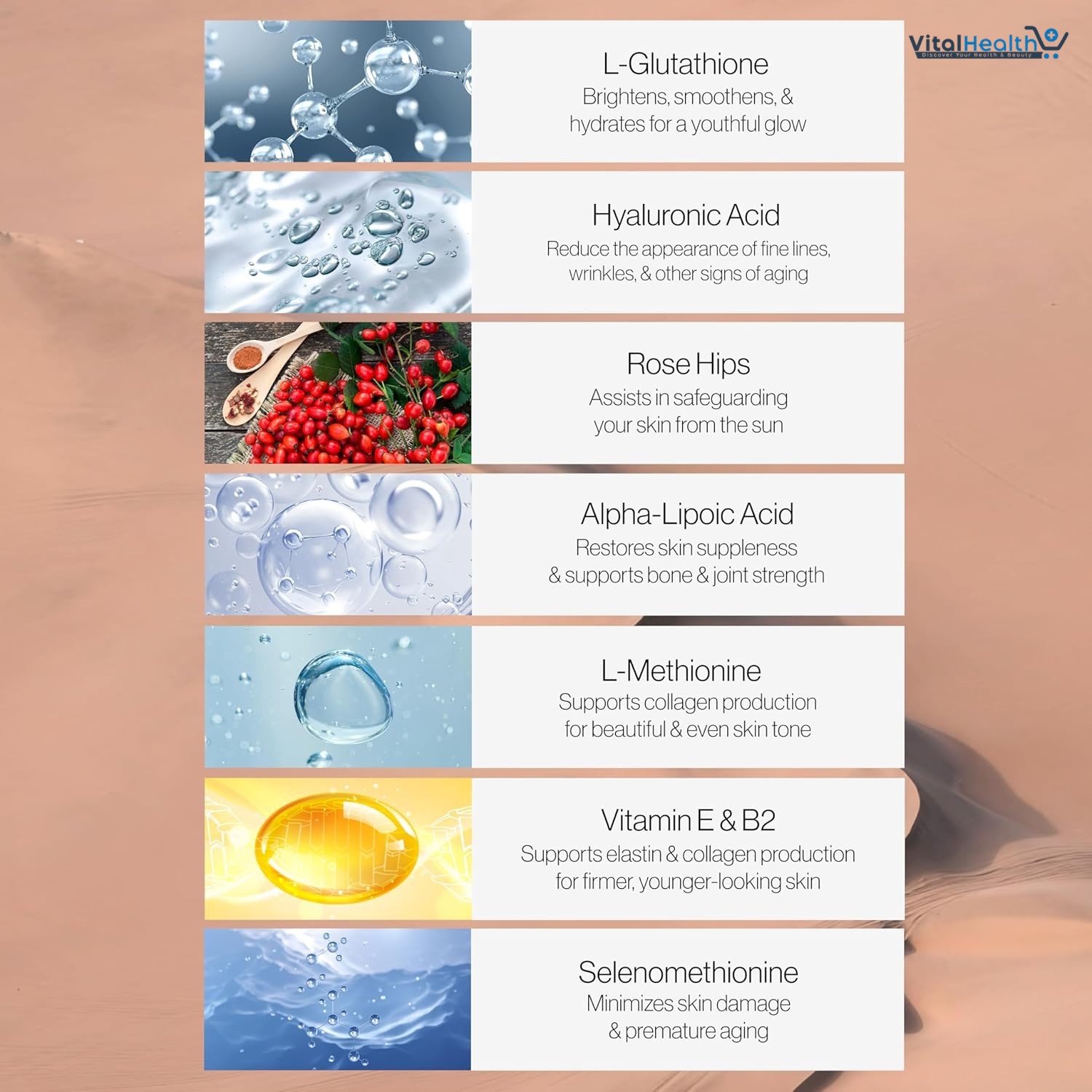 Max Dose Glutathione with 6X Advanced Boosters: This formula delivers 1650mg of reduced L-Glutathione per serving—the maximum effective dose for internal brightening support. Combined with 6 glutathione boosters including Alpha Lipoic Acid, NAC, and Vitamin E, it promotes a visibly radiant complexion and helps your body maintain optimal glutathione levels for skin and cellular wellness.