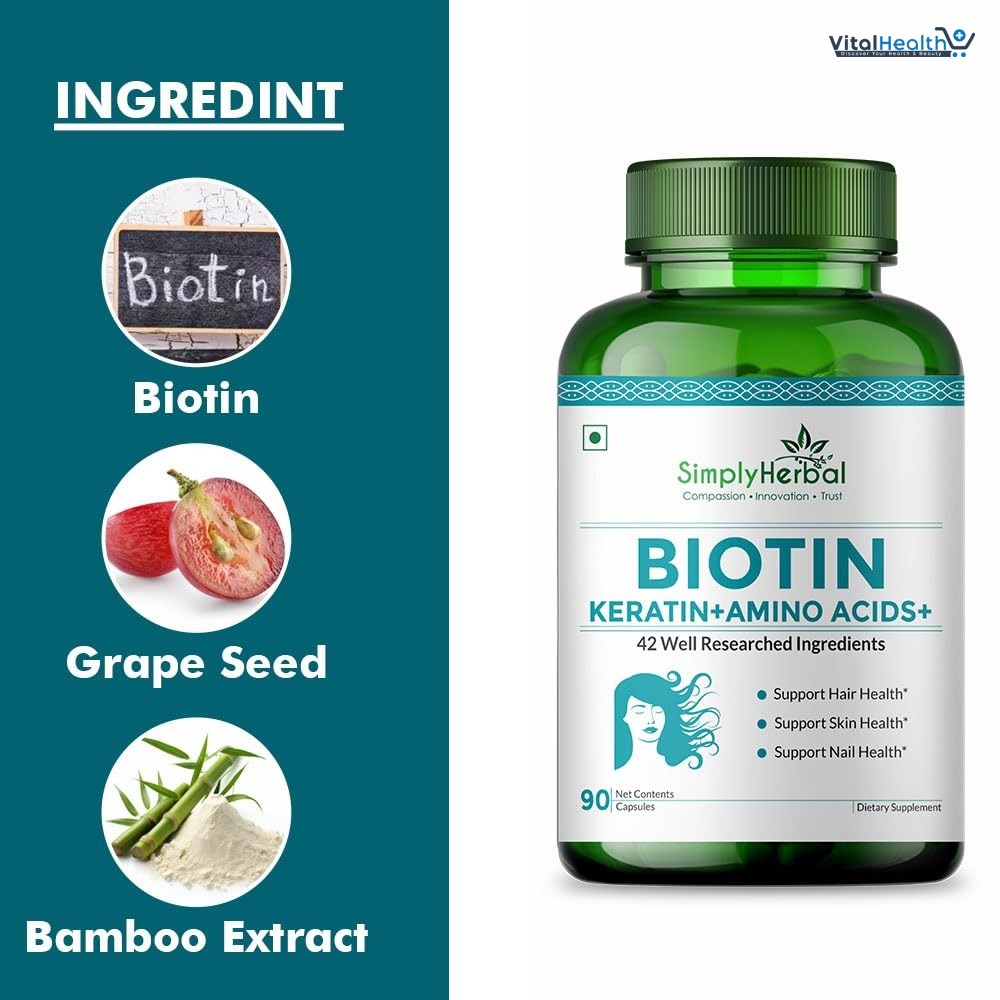 Our Simply Herbal Biotin Supplement With Keratin Provides Ultimate Nourishment to Stimulate Growth, Enhance Strength and Promotes Hair & Nails Health. Our Unique Formula Includes Biotin and Keratin Bamboo Extract to Help Get Your Glow Back From the Inside Out, Without Having to Buy Separate Supplements.