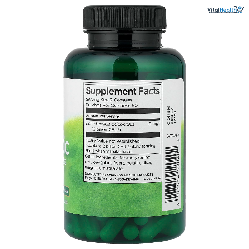 Lactobacillus acidophilus 2 billion,Other Microcrystalline cellulose , gelatin, silica, magnesium stearate., take two capsules with water before a meal. For children, one capsule with water before a meal.,Lactobacillus acidophilus 2 billion,Other Microcrystalline cellulose , gelatin, silica, magnesium stearate.