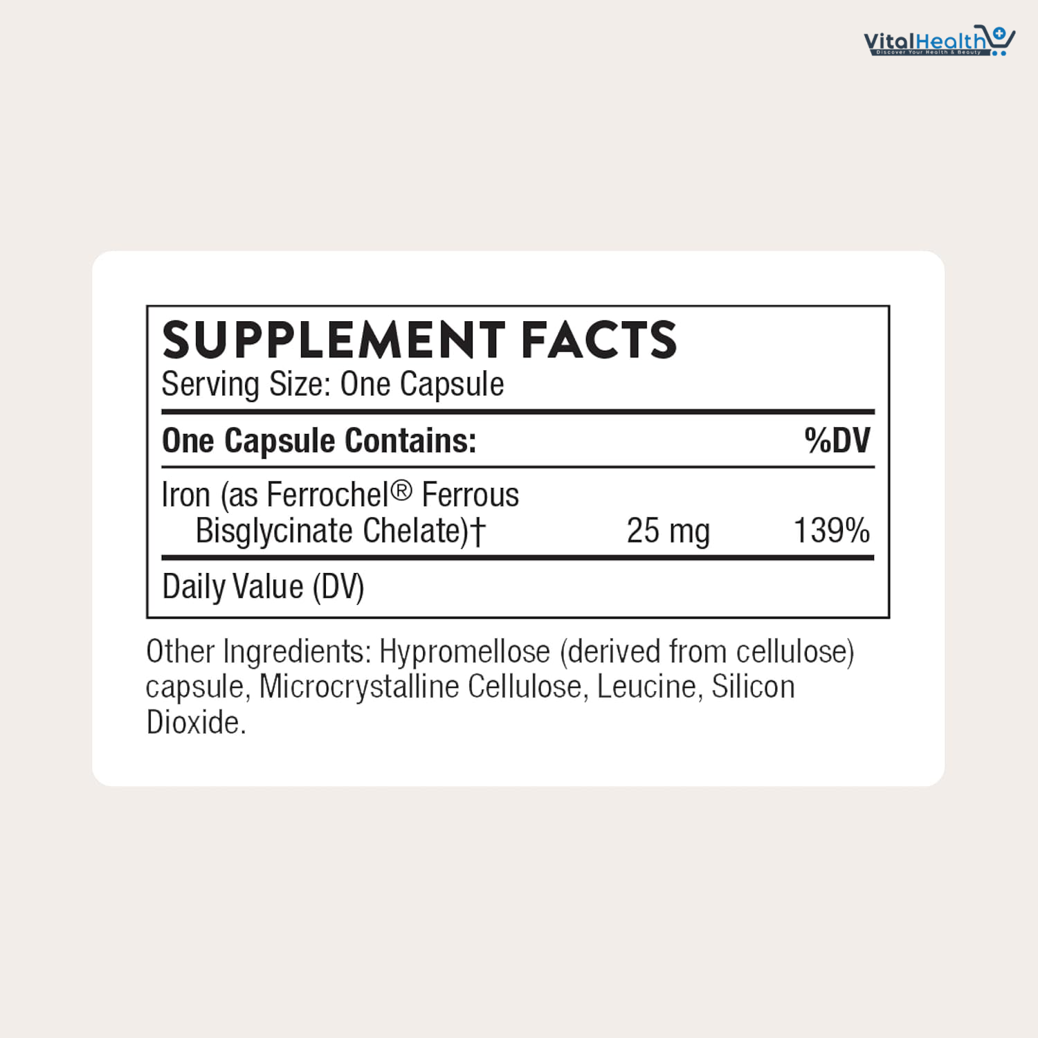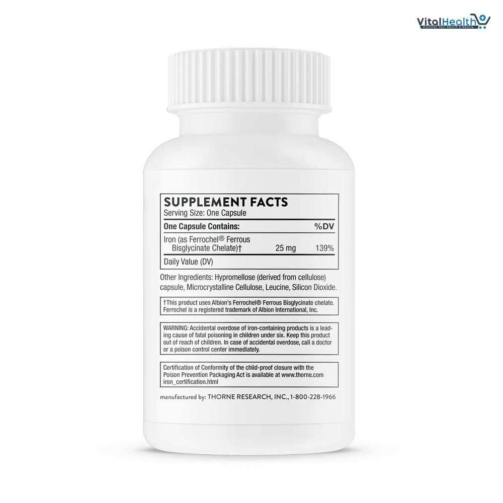 Iron (as Ferrochel Ferrous Bisglycinate Chelate) 25 mg. Other Ingredients: Hypromellose (derived from cellulose) capsule, Microcrystalline Cellulose, Leucine, Silicon Dioxide.