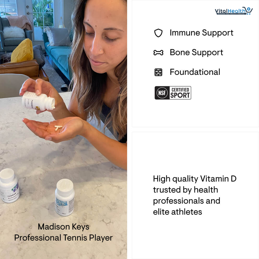 Thorne’s D-5,000 contains 5,000 IU of high-quality vitamin D3 and is NSF Certified for Sport®. Although it is well known that direct sunlight is a natural source of vitamin D, many individuals, especially the elderly, don’t get enough vitamin D from sunlight or from their diet. Be sure you get the vitamin D your body needs with Thorne’s easily absorbed Vitamin D-5,000. The optimal amount of vitamin D for an individual depends on many factors and varies from person to person. Therefore, the requirement for vitamin D supplementation should be individualized. Either of Thorne’s D-1,000 or D-5,000 can be an ideal way to maintain an optimal level of vitamin D in healthy individuals. Because athletes need to know their supplements are trustworthy and compliant, every batch of an NSF Certified for Sport® product is tested for compliance with label claims and to ensure the absence of nearly 300 substances banned by many major athletic organizations.