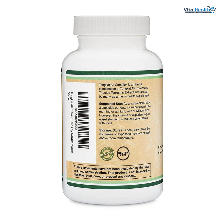 Eurycoma Longifolia Root Extract 200:1, Tribulus Terrestris 20mg, Other Ingredients: Veggie Capsule, Rice Flour.