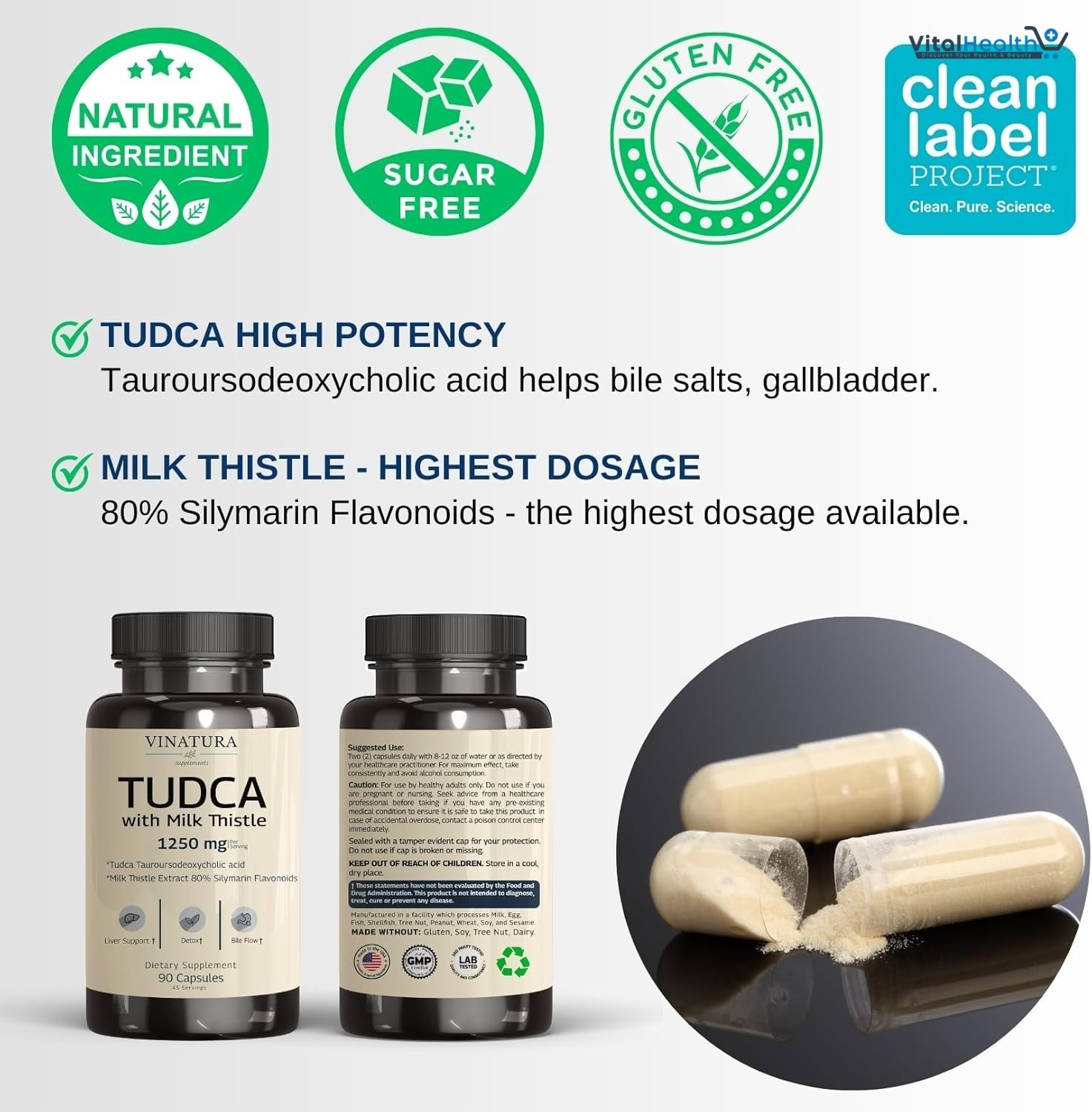 TUDCA with Milk Thistle Support your liver health in one powerful supplement. 90 capsules for 45 servings. Each serving contains 1250mg - the strongest liver supplement! Each serving contains TUDCA (or Tauroursodeoxycholic acid), a natural hydrophilic bile acid salt that helps to maintain hepatic and biliary health. This liver support supplement helps bile salts, gallbladder.
